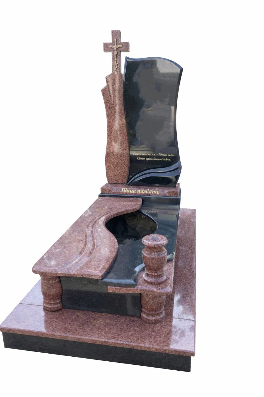 Фігурна стела складається з двох частин: червоної гранітної основи з класичним хрестом та чорної полірованої плити для портрета й написів. Оригінальна форма стели створює м’який, плавний силует і робить пам’ятник унікальним.