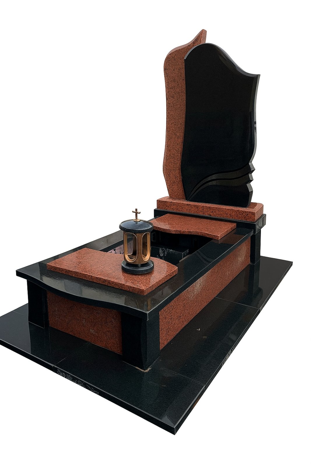 Одинарний гранітний пам’ятник у сучасному дизайнерському виконанні, що поєднує глибокий чорний граніт із благородним червоним Кам’янським гранітом. Стела має оригінальну хвилеподібну форму з плавними лініями, що м’яко переходять у декоративні елементи, створюючи ефект об’ємності та вишуканості.