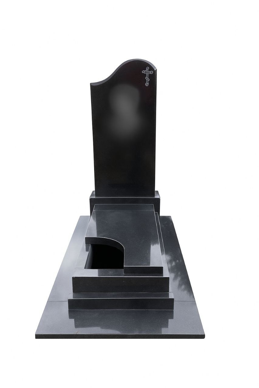 Горизонтальна частина виконана у формі декоративної накривки з плавною вигнутою лінією, що створює ефект багаторівневої композиції. Модель виглядає монолітно, сучасно та дуже акуратно завдяки чистому чорному полірованому граніту, який зберігає свій вигляд десятиліттями.