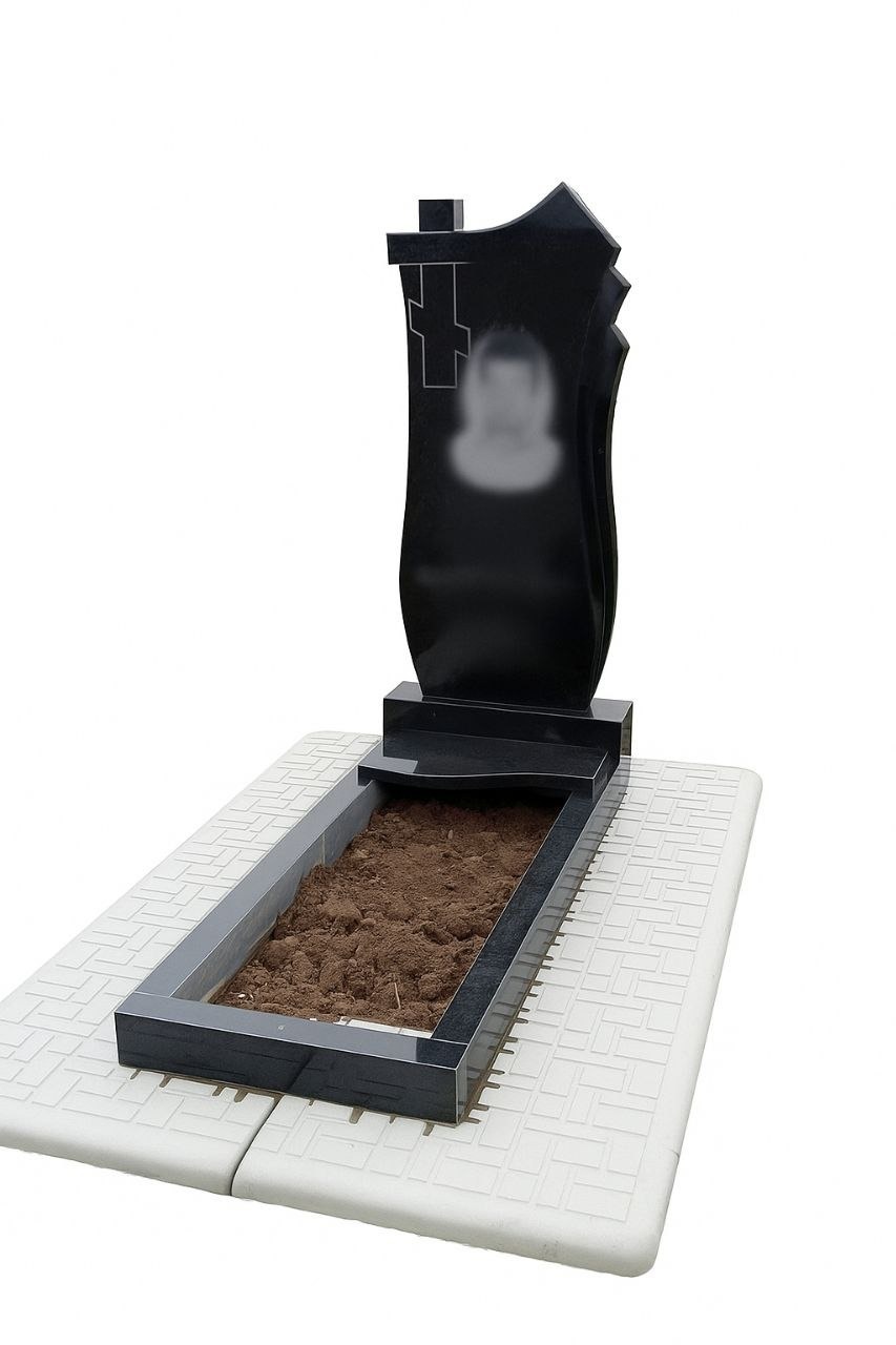 У верхній частині стели розміщено витончений контурний хрест, який підкреслює духовний сенс композиції. Перед стелою розташована декоративна хвиляста накривка, що плавно переходить у рамку квітника. Це робить ансамбль збалансованим та завершеним.