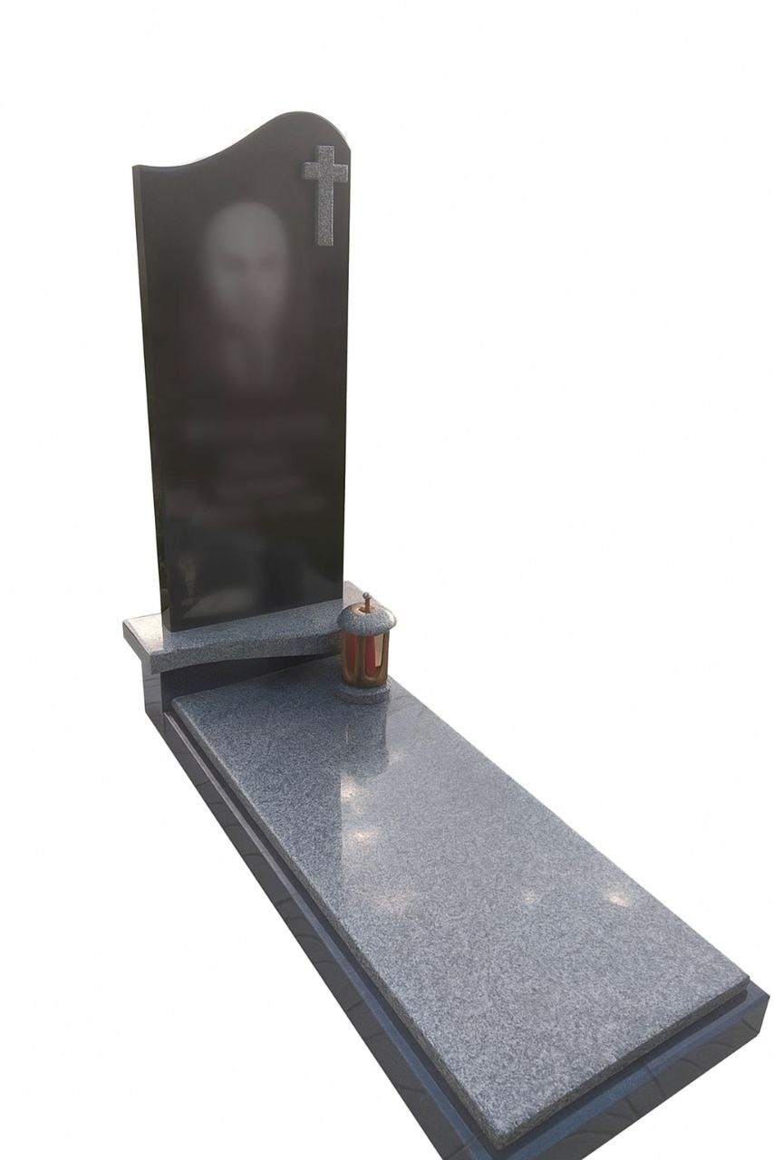 Горизонтальна частина виконана зі світло-сірого граніту, що контрастує з темною стелою, створюючи дуже приємне візуальне поєднання. Перед стелою встановлена гранітна підставка з декоративною лампадкою, що надає композиції завершеності та затишку.