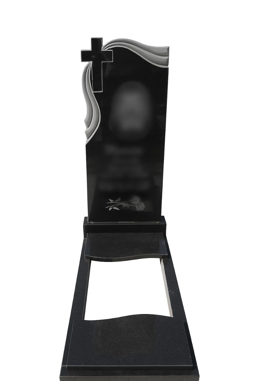 Вишуканий одинарний пам’ятник із натурального чорного граніту, виконаний у стильному художньому дизайні. Стела має унікальну фігурну форму з хвилястими лініями, що плавно переходять у декоративні «форми-стрічки» світлого каменю. Такий дизайнерський акцент створює ефект м’якості й руху, роблячи пам’ятник по-справжньому виразним.