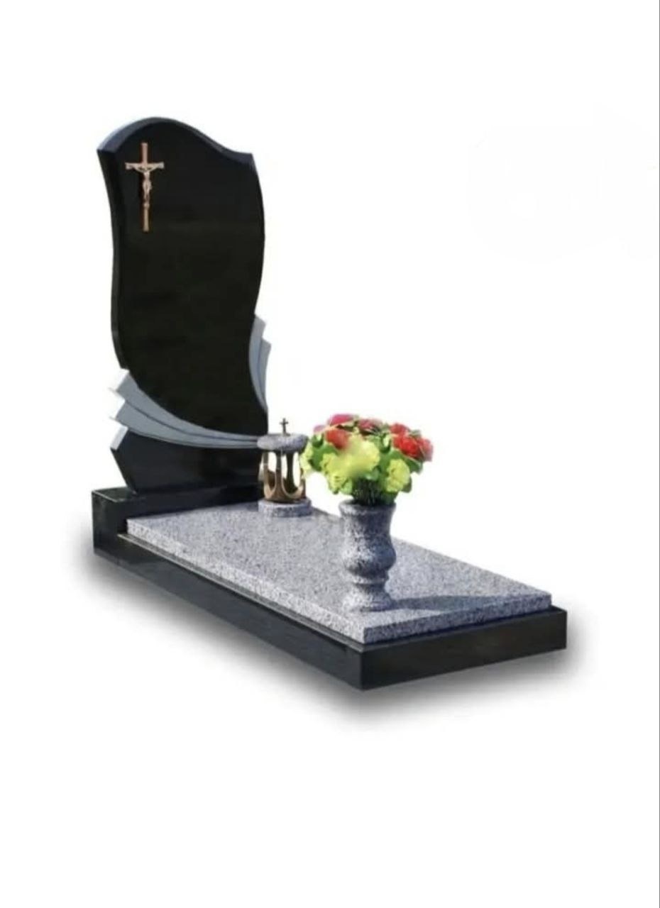 У верхній частині розміщений рельєфний латунний або бронзовий хрест із розп’яттям, який надає композиції урочистості та глибокого духовного змісту. Горизонтальна частина виконана зі світло-сірого граніту, доповнена темною рамкою і встановленою декоративною лампадкою та вазою для квітів.