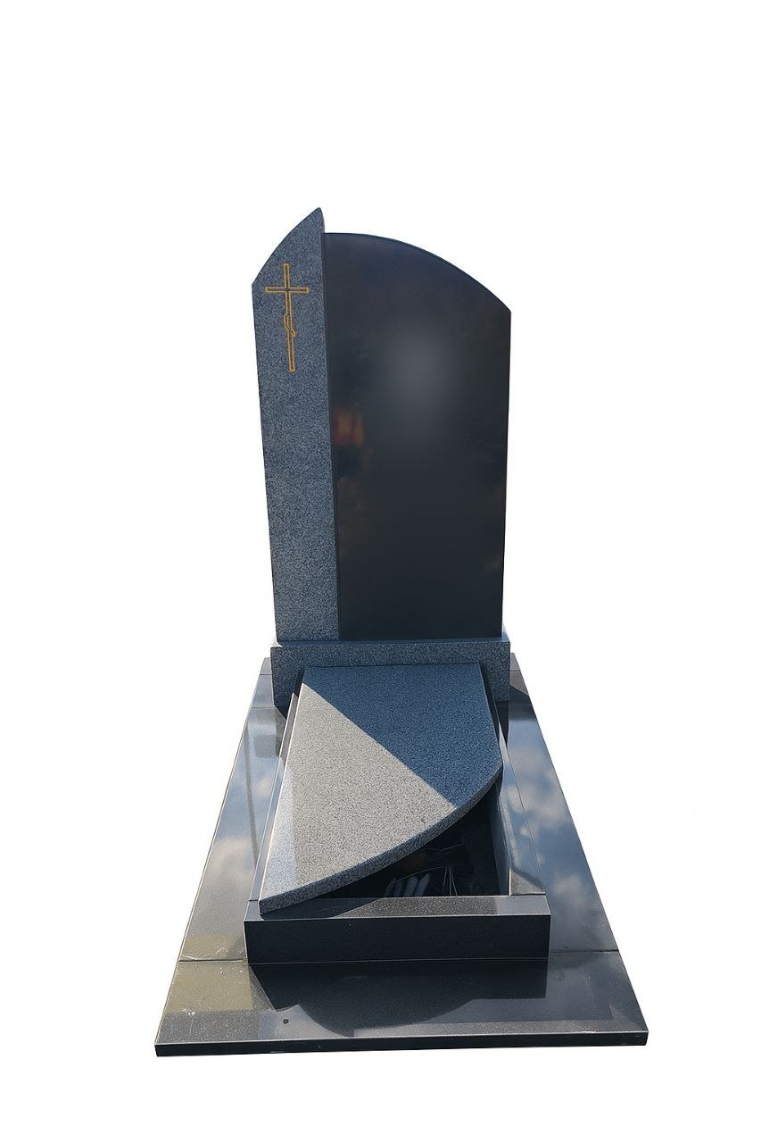 Ліва частина стели виготовлена зі світло-сірого граніту та прикрашена золотим гравірованим хрестом, який підкреслює духовний характер пам’ятника. Права частина — глибокий чорний полірований граніт, ідеальний для портрета та написів.