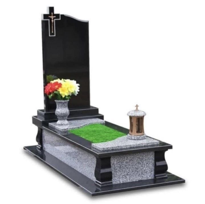 Вишуканий одинарний пам’ятник із поєднанням чорного полірованого граніту та світло-сірого граніту — модель, що підкреслює стриману елегантність і вічність пам’яті. Головна стела має класичну прямокутну форму з плавною верхньою лінією, а також декоративним хрестом, що додає духовного змісту та символічності.