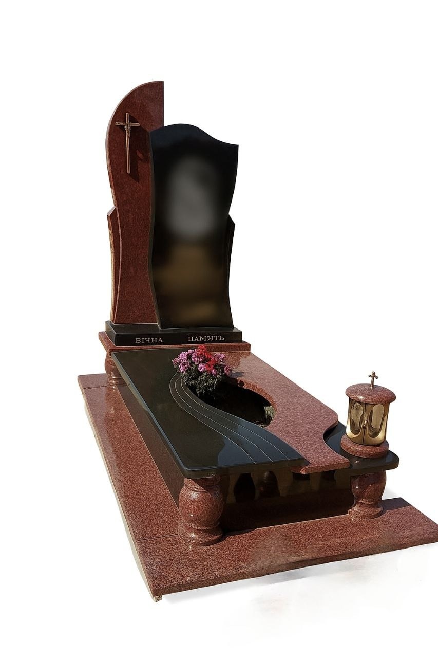Елегантний гранітний пам’ятник у вишуканому поєднанні глибокого чорного та насиченого бордового каменю. Фігурна стела має плавні художні лінії та природну форму, яка створює відчуття гармонії й спокою. Друга стела з бордового граніту прикрашена рельєфним бронзовим хрестом, що символізує віру та світлу пам’ять.