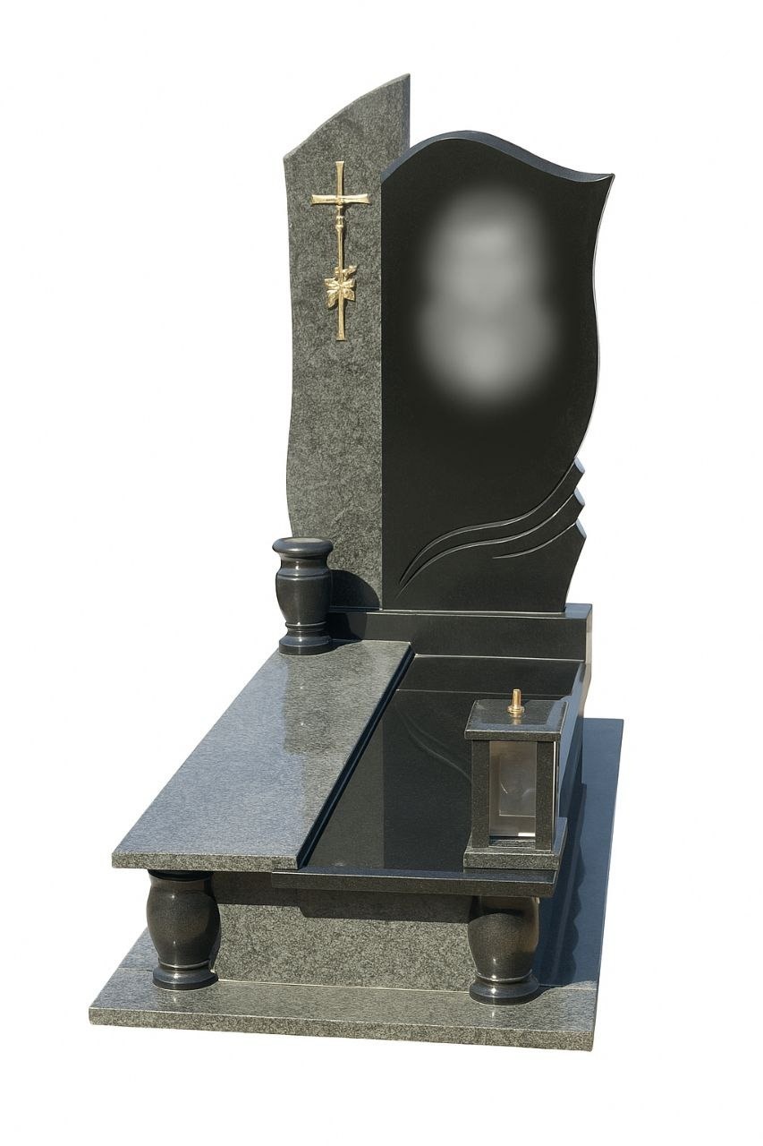 Горизонтальна частина пам’ятника складається з двох площин: світло-сірого полірованого граніту та чорного дзеркального каменю. Декоративні масивні опори та міцний цоколь підкреслюють монументальність конструкції. Лампадка та ваза зіграні в єдиному стилістичному рішенні, що робить комплекс завершеним та гідним.