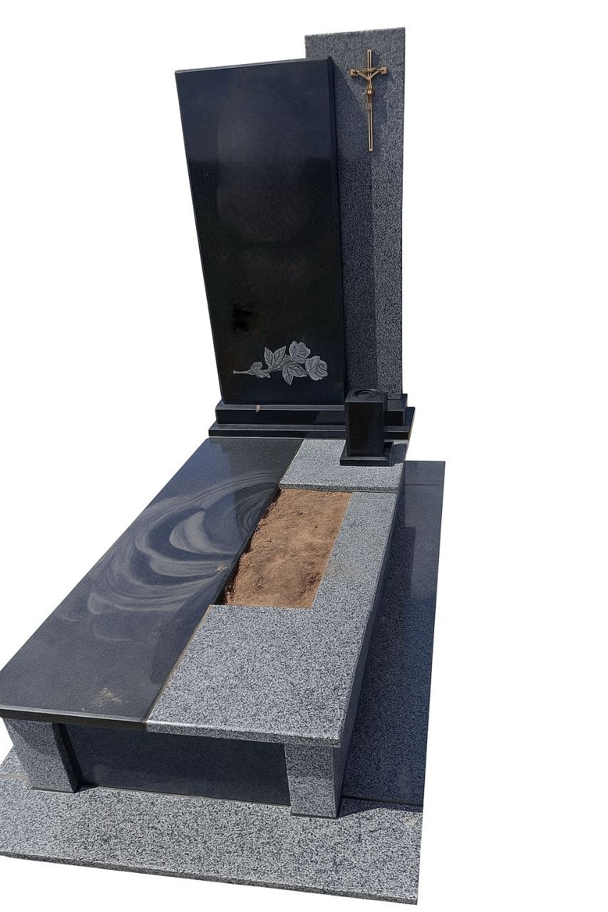 Друга вертикальна вставка зі світлого граніту гармонійно контрастує з чорним каменем та прикрашена бронзовим хрестом — символом віри та вічного спокою.