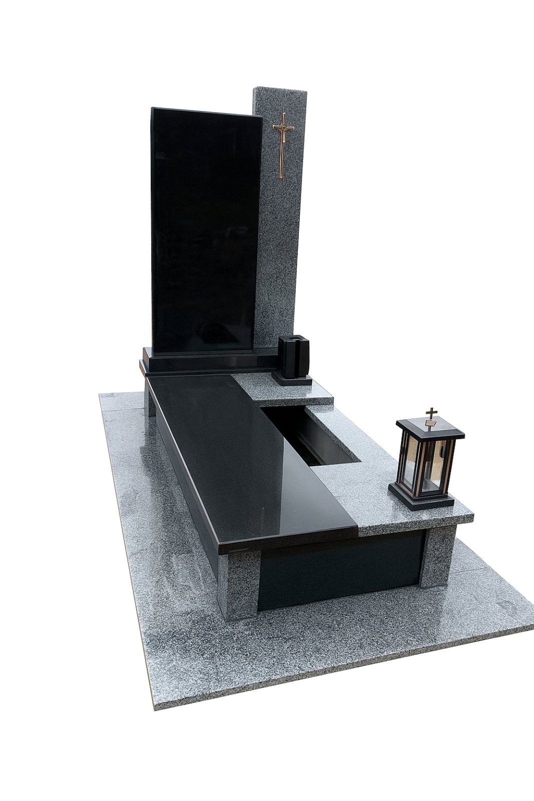 Горизонтальна частина виконана в сучасному стилі: високий чорний гранiт формує основну плиту, а світло-сірий граніт додає геометрії та об’єму. Композицію доповнюють декоративні елементи — гранітна лампадка та місце під квіти, що робить комплекс не лише естетичним, а й функціональним.